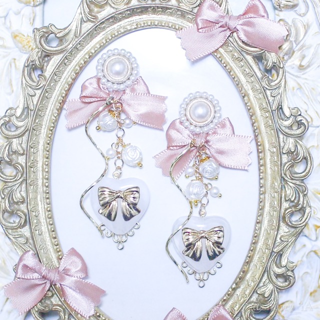 rococo twinkle ribbon【ロリィタ/ロリータ ハート ガーリー ロマンチック バレンタイン リボン パール ピアス/イヤリング】
