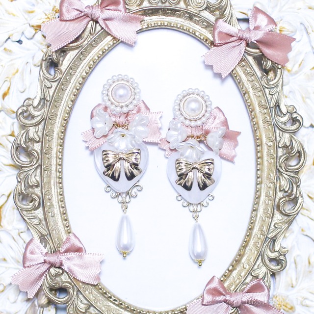 ?sweet rococo一点ものアクセサリーシリーズ? 【作品のコンセプト】 ”ハート×ロココ”をテーマにガーリーでロマンチックな可愛らしさを目指したピアス/イヤリングです。 甘さと上品さをmixし、オトナ乙女のためのお嬢様スタイルを追求しました。 ホワイトとクリアのマーブル模様のハートビーズにキュッと結ばれたリボンのチャームを飾りつけた可愛さ満載の耳飾り? ハートもリボンも大好きな乙女の理想がつまったアクセサリーとなっています? チョコレートピンクのリボンとパールビーズをあしらって、さらに可愛く上品な大人乙女にぴったりな唯一無二の耳飾りが完成しました? ロマンチックで可愛らしいオトナ乙女になってみませんか? ⌒¨⌒¨⌒¨⌒¨⌒¨⌒¨⌒¨⌒¨⌒¨⌒¨⌒¨⌒¨⌒¨⌒¨⌒¨⌒¨⌒¨ 【おすすめのシチュエーション】 パールやリボンで作った上品で可愛らしい耳飾り。 女子会やお買い物、カフェでお茶など、お洒落しておでかけしたい時にぴったりです。 また、お花見や会席ディナーといったイベントごとでのおめかしにもお使いいただけます? 大きめなので巻き髪などの耳が隠れてしまいがちなスタイルでも存分に可愛さを発揮してくれます? クローゼットにあるとびっきりに可愛いお洋服と一緒に着て、大好きなコーディネートで素敵な一日を過ごしてもらえると嬉しいです? ・気分をあげたいときに? ・いつもと違う自分になりたい方へ? “可憐で可愛い”アミュリボンのアクセサリーはいかがでしょうか? ⌒¨⌒¨⌒¨⌒¨⌒¨⌒¨⌒¨⌒¨⌒¨⌒¨⌒¨⌒¨⌒¨⌒¨⌒¨⌒¨⌒¨ 【作品の詳細】 こだわり① 「“甘いモチーフ”と“ロココな上品さ”でオトナ乙女のためのお嬢様スタイルにこだわりました?」 ハートのビーズ、リボンのチャーム、チョコレートピンクのリボンで甘さを。 パール、ロココを思わせる華やかなゴールドの装飾を繊細にちりばめ上品な雰囲気に。 甘い雰囲気と上品なデザインでうっとり夢心地になれるアクセサリーに仕上げました? ガーリーでロマンチックなアクセサリーを身に纏い、まだ見ぬロマンスと出会ってみませんか? こだわり② 「ジュエリーのような輝きあふれるアクセサリーに?」 パールカボションにゴールドの装飾が施された繊細なパールカボションでアクセサリーを制作。 こだわりの詰まったパールカボションの周りに2.5mmの小さなパールを縫い付け、まるでジュエリーのような高級感のあるアクセサリーとなりました? パールをふんだんに使ったアクセサリー。 大好きなモチーフをたくさんの詰め込み、可愛くリボンを結んで作り上げた”ここにしかないアクセサリー”をお楽しみください? ⌒¨⌒¨⌒¨⌒¨⌒¨⌒¨⌒¨⌒¨⌒¨⌒¨⌒¨⌒¨⌒¨⌒¨⌒¨⌒¨⌒¨ 【作品の仕様】 ビーズ刺繍部分はフェルトに縫い付け、裏面をボンドで覆うのでかっちり固まり頑丈な作りになっています。 たくさん使ってもらいやすいように土台や裏側でしっかりと丈夫になるよう作っておりますので安心してご着用くださいね。 size:3cm×8cmほど weight:7.7gほど ⌒¨⌒¨⌒¨⌒¨⌒¨⌒¨⌒¨⌒¨⌒¨⌒¨⌒¨⌒¨⌒¨⌒¨⌒¨⌒¨⌒¨ 金属アレルギー対応 樹脂ピアス ご褒美 大人可愛い 大人ガーリー 量産型 ロリィタ ロリータ クラシカル クラロリ マーメイド 結婚式 お呼ばれ 卒業式 ウェディング ブライダル 晴れ着 ドレス 成人式 誕生日プレゼント 母の日 着物 浴衣 振袖 ライブ コスプレ 個性的 揺れる ゆらゆら 遊園地 パーティー 入学式 卒園式 入園式