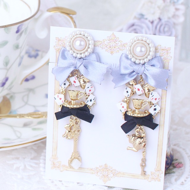 不思議の国のアリスのお茶会耳飾り -アリス- 〈不思議の国のティーパーティーをモチーフにしたピアス/イヤリング〉トランプ うさぎ ティースプーン ティーポット 鍵 角砂糖 水色