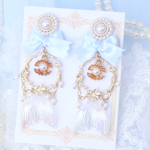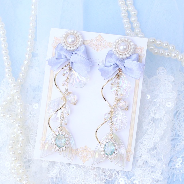 人魚姫の舞踏会〈マーメイドの耳飾り〉リボン パール ピアス/イヤリング アクセサリー 水色 白 ピンク