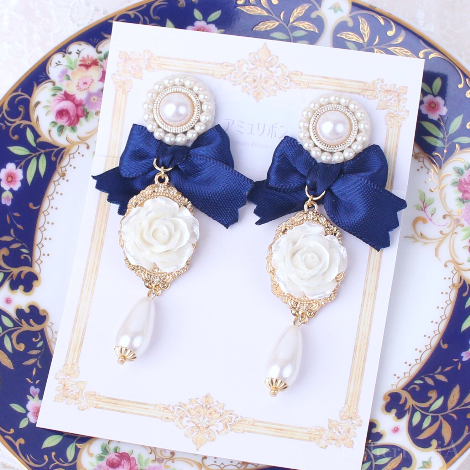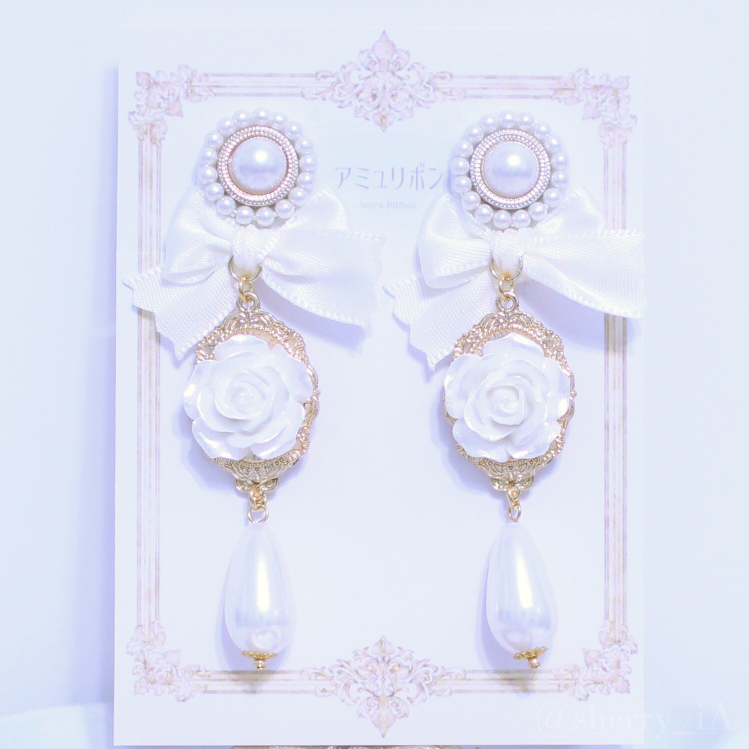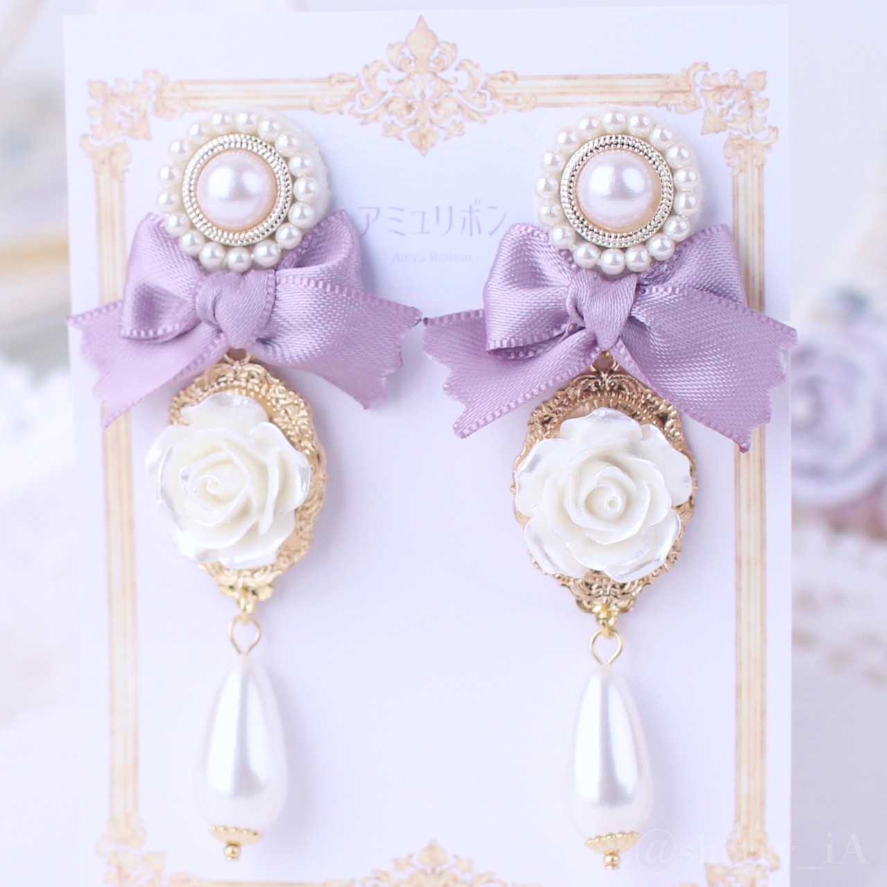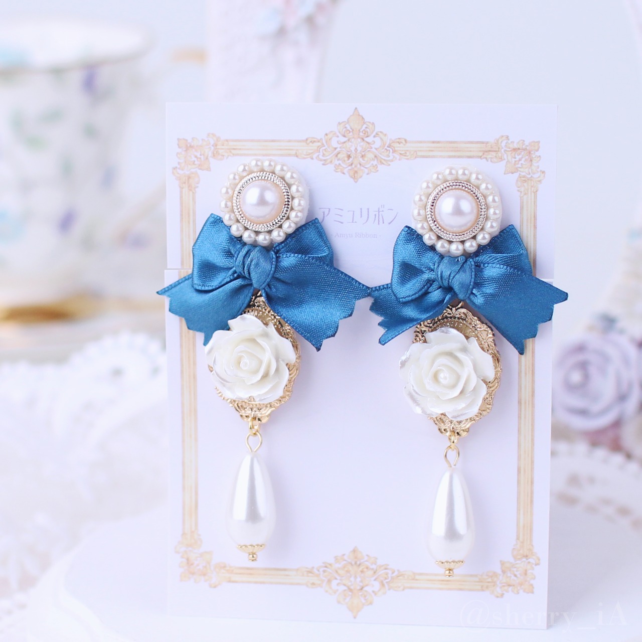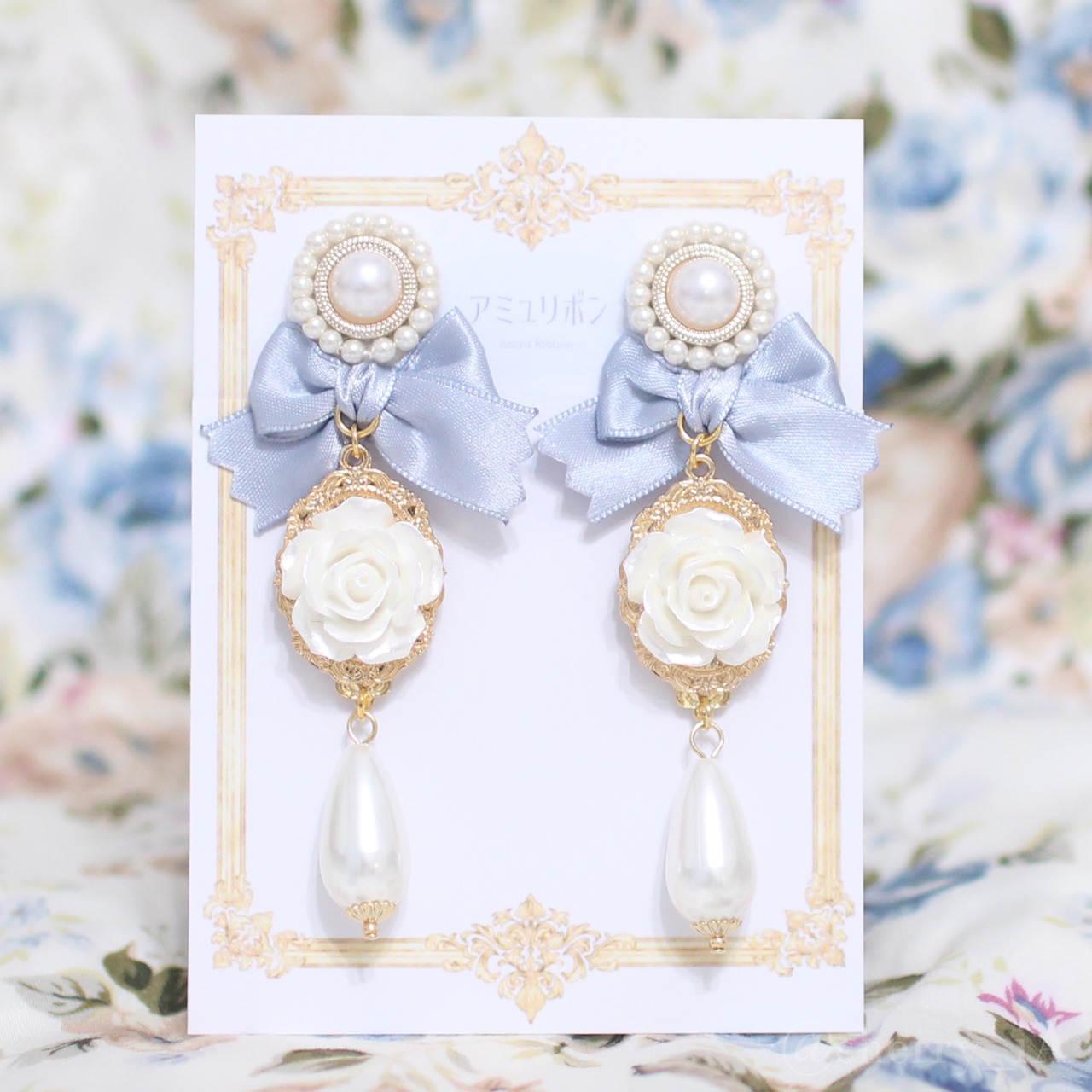 白薔薇の花園 耳飾り〈クラシカルなホワイトローズの耳飾り〉リボン パール ピアス/イヤリング アクセサリー 水色 青緑 ネイビー 紫 バーガンディ 白 ピンク ラベンダー