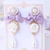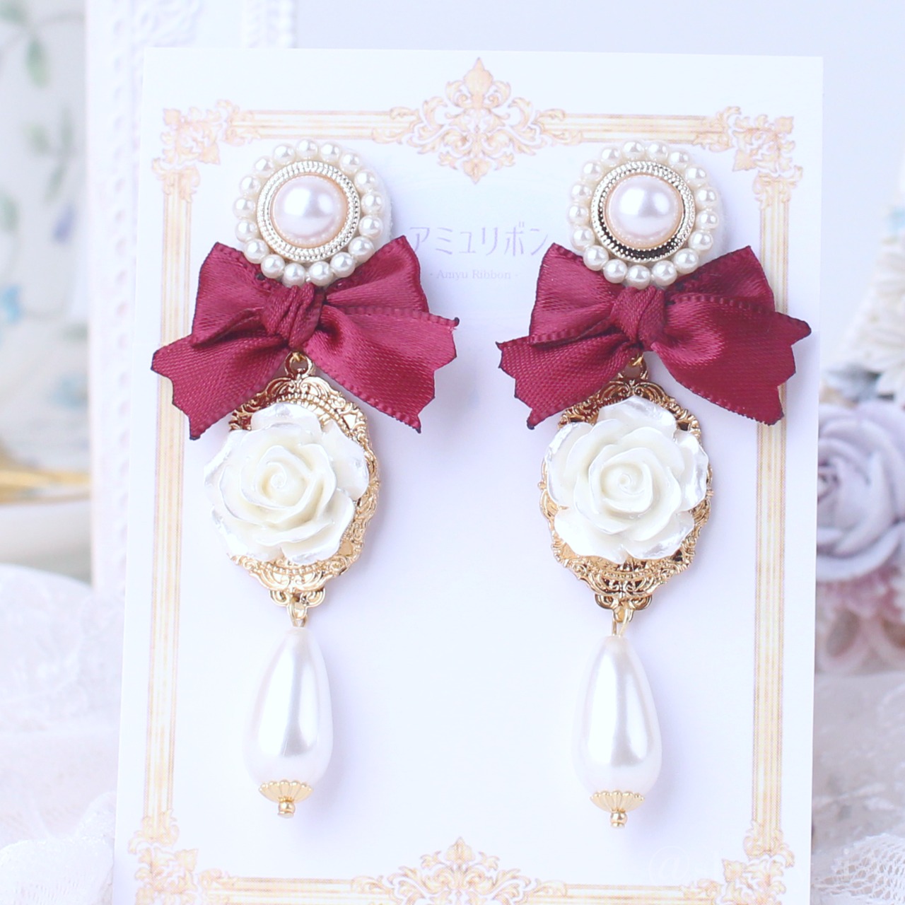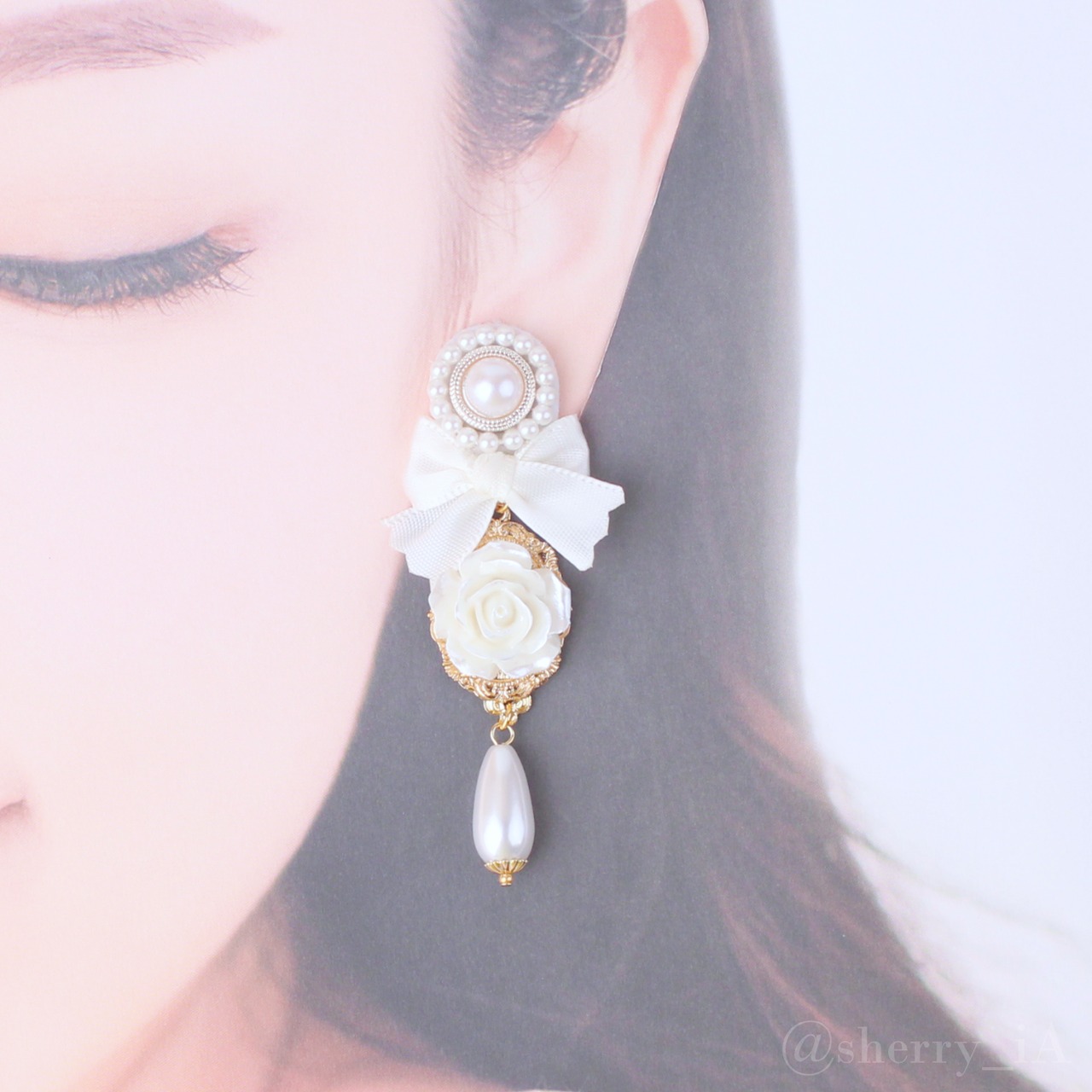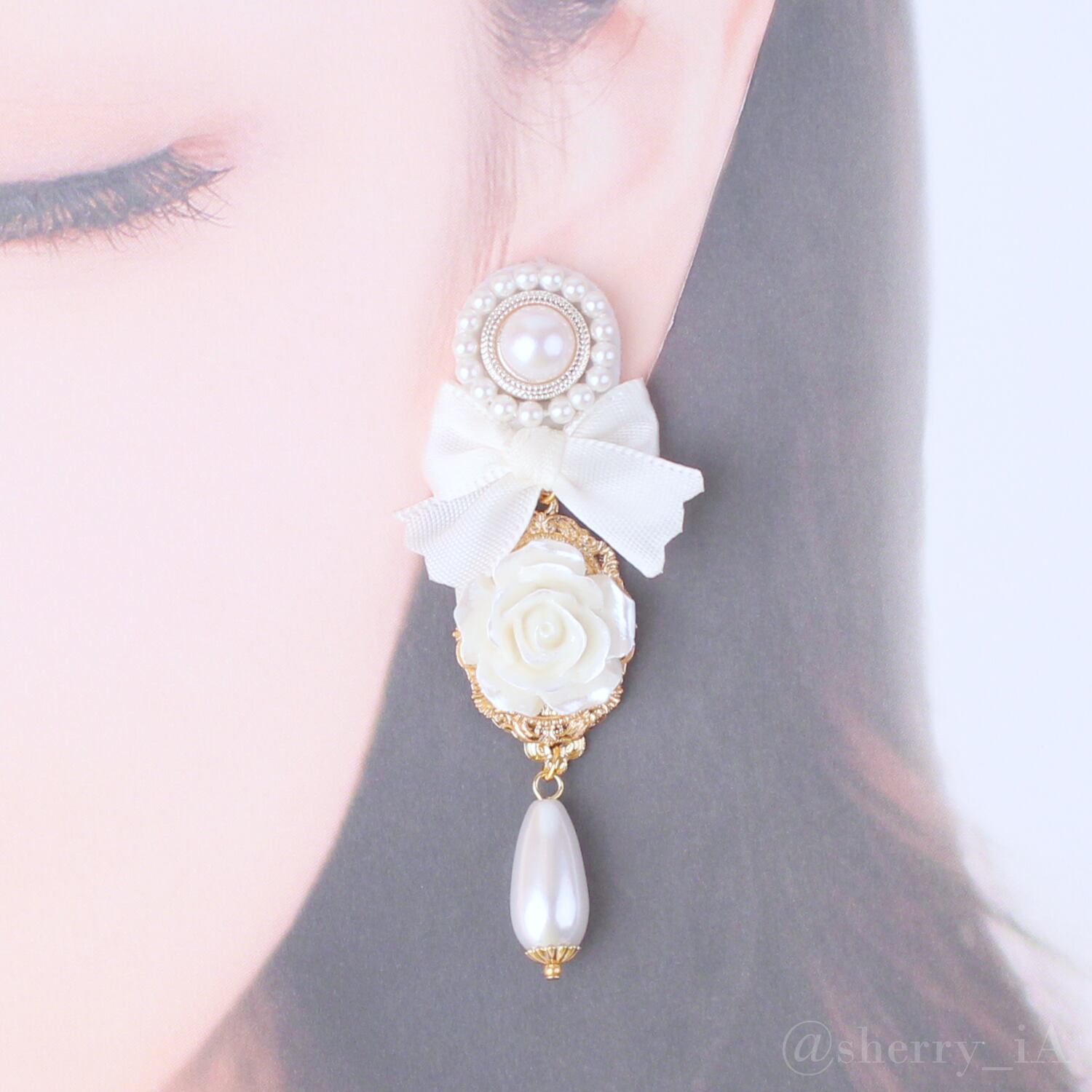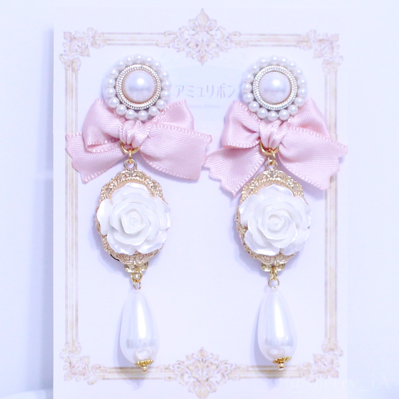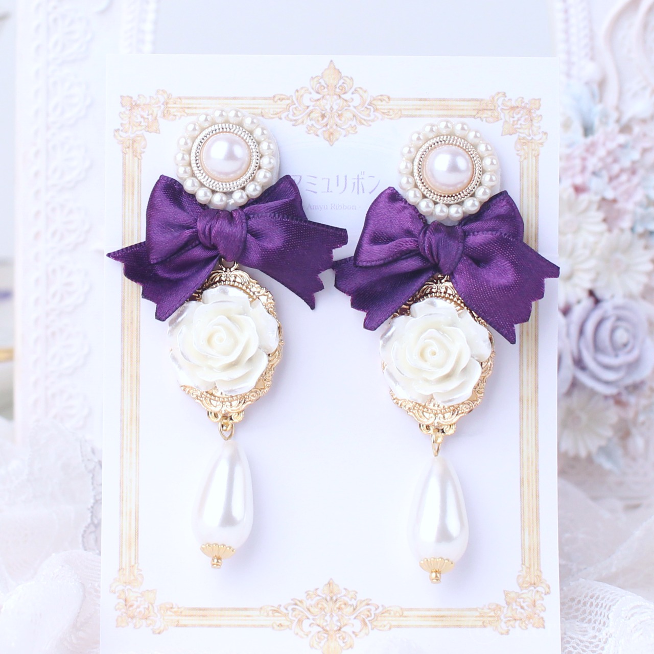 白薔薇の花園 耳飾り〈クラシカルなホワイトローズの耳飾り〉リボン パール ピアス/イヤリング アクセサリー 水色 青緑 ネイビー 紫 バーガンディ 白 ピンク ラベンダー