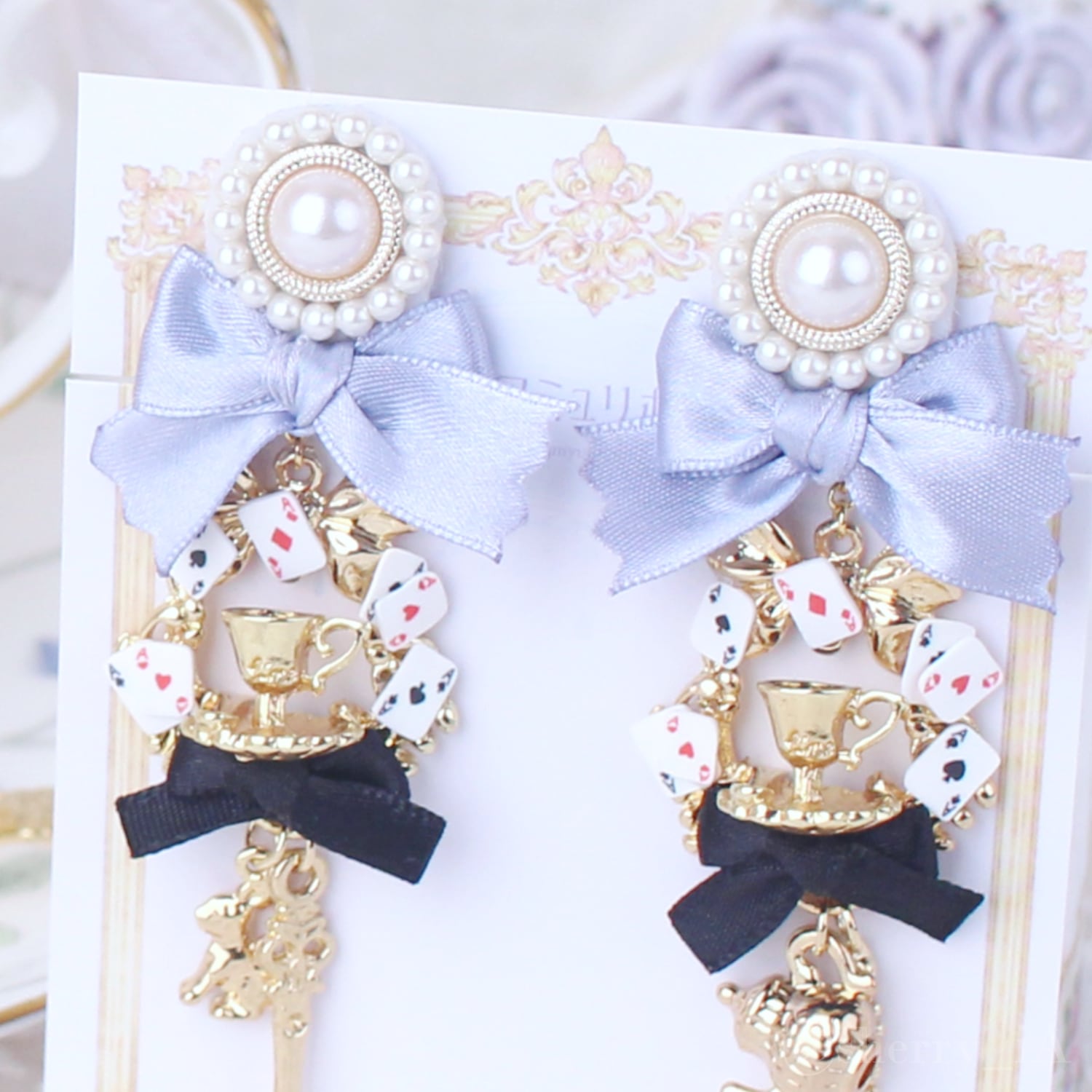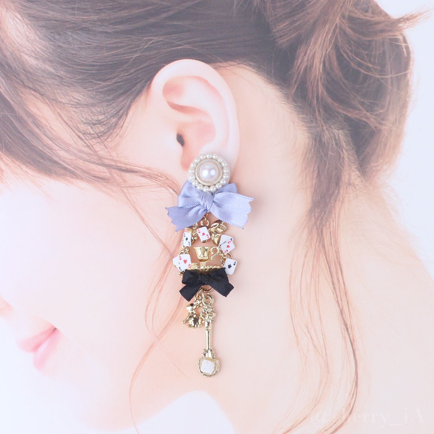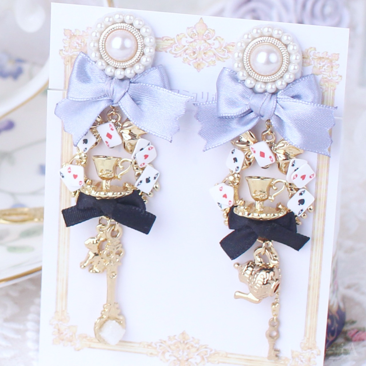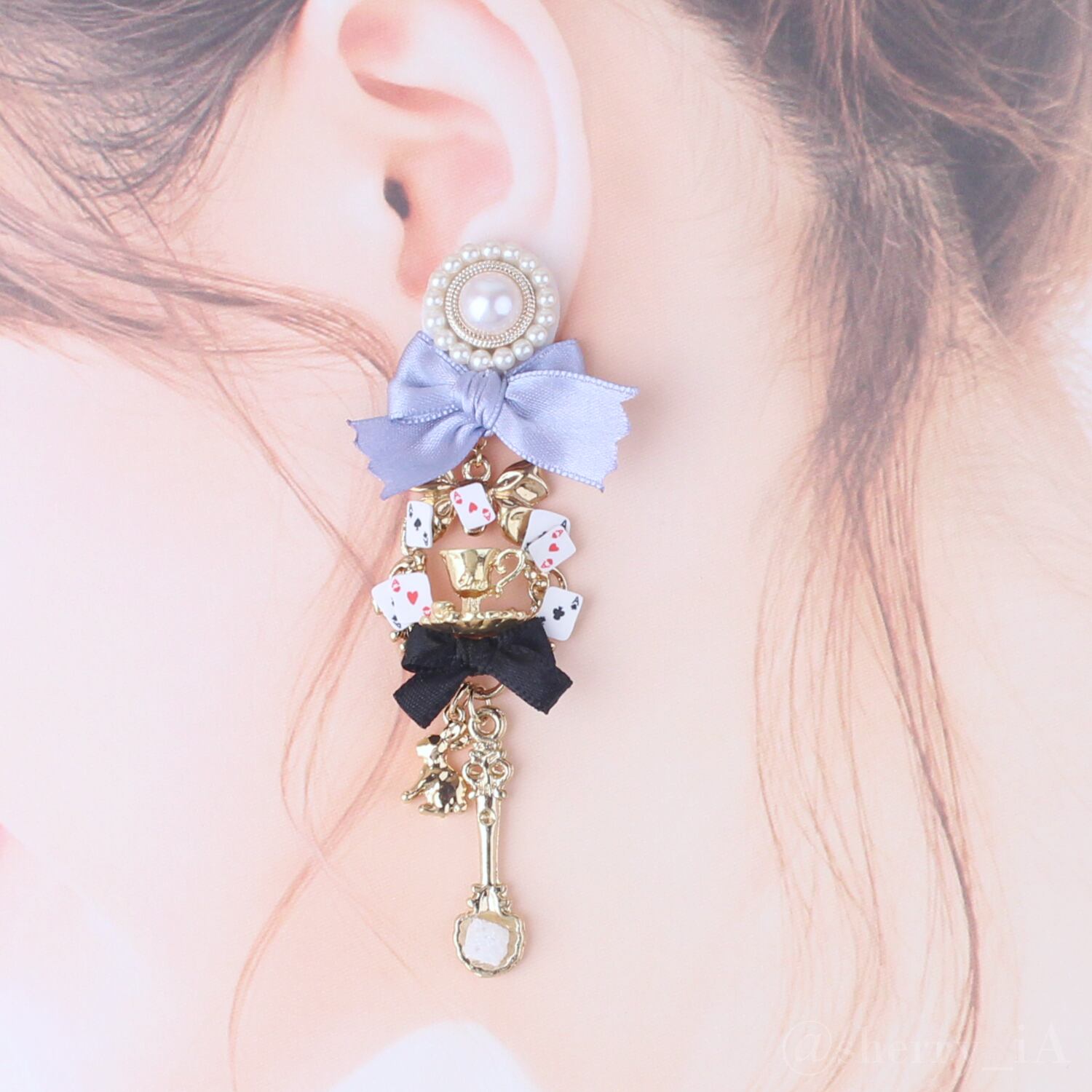 不思議の国のアリスのお茶会耳飾り -アリス- 〈不思議の国のティーパーティーをモチーフにしたピアス/イヤリング〉トランプ うさぎ ティースプーン ティーポット 鍵 角砂糖 水色