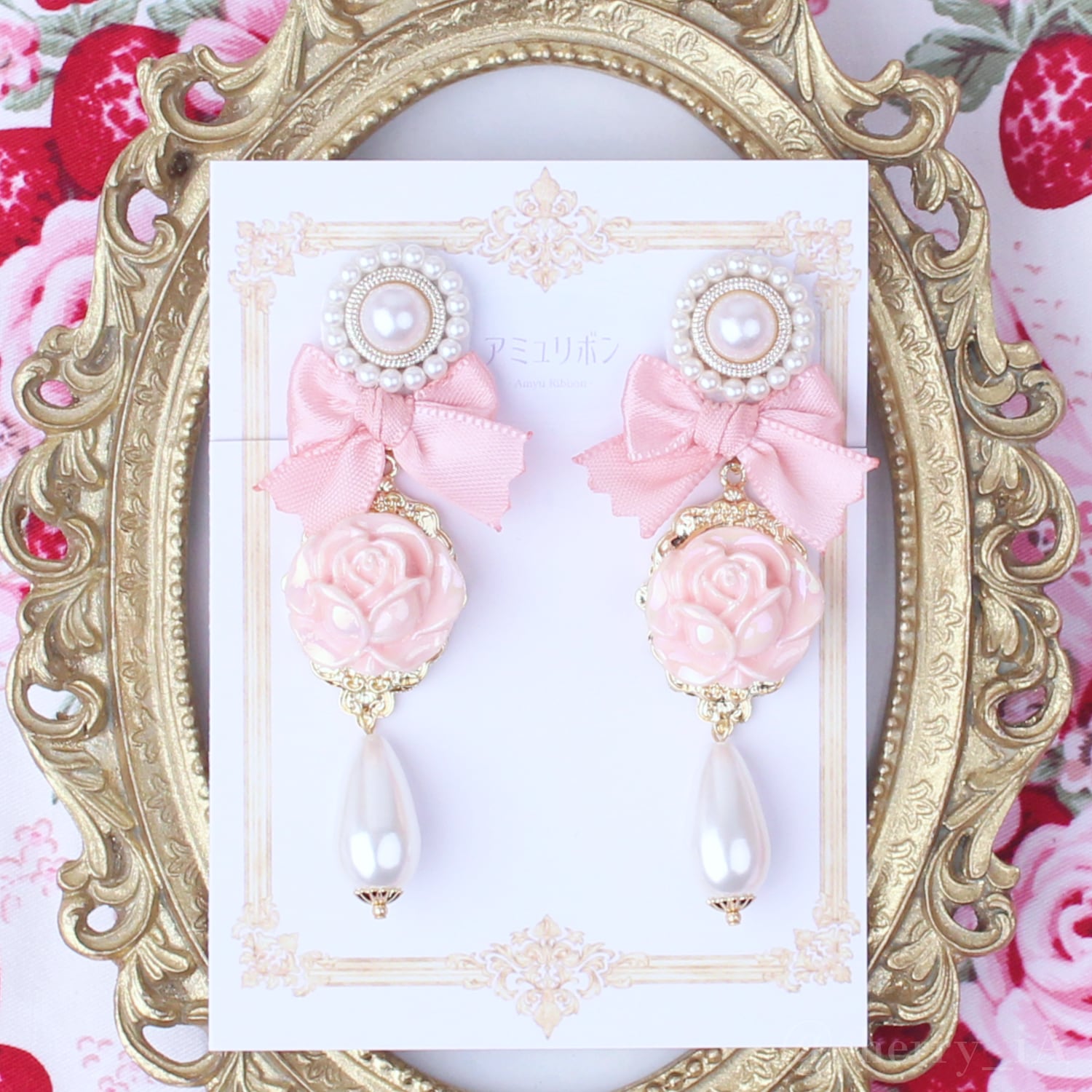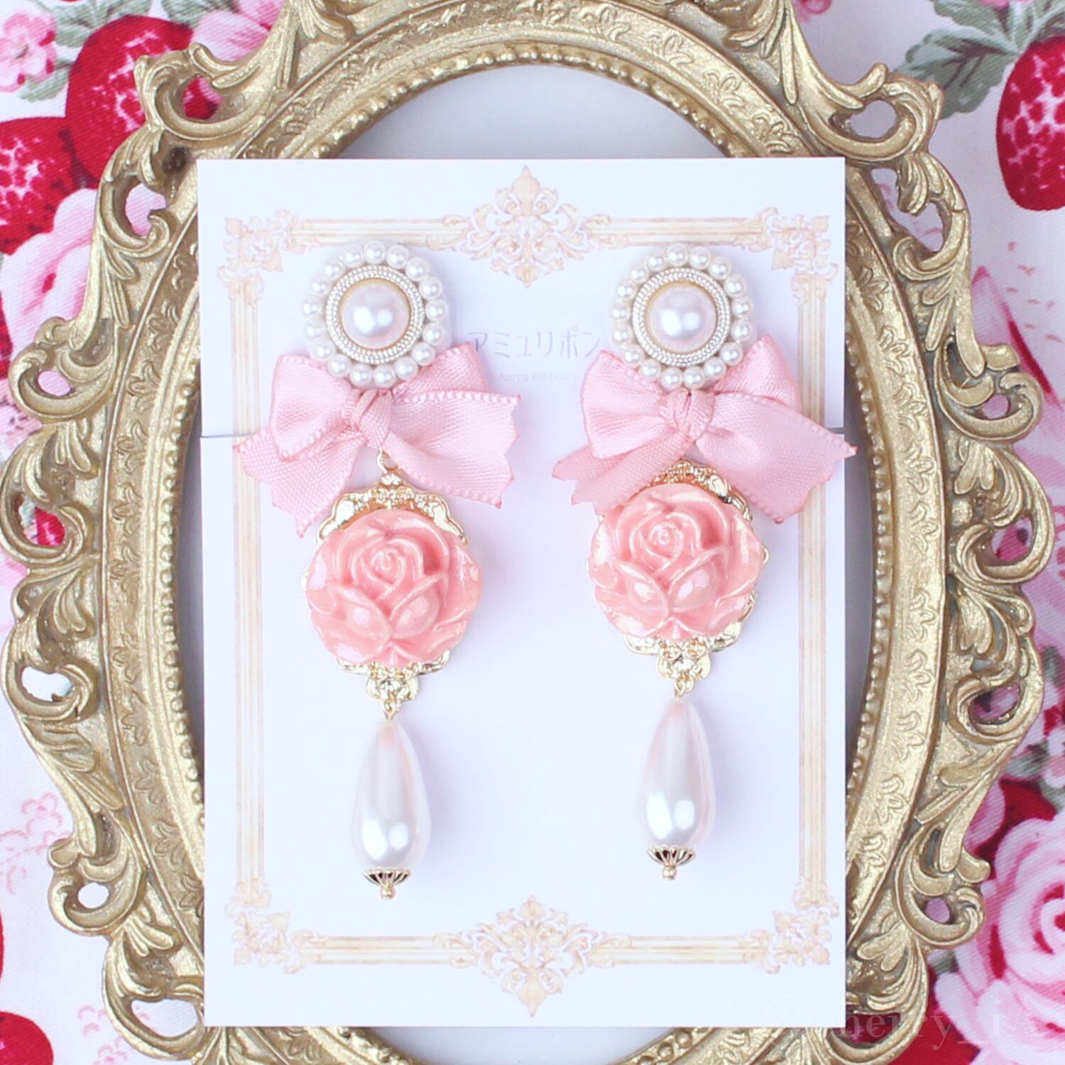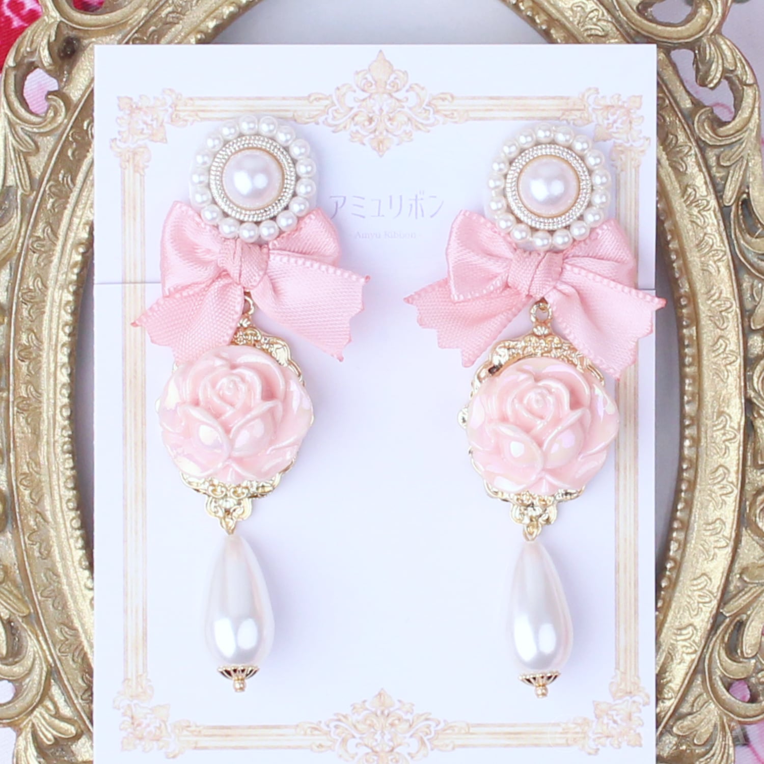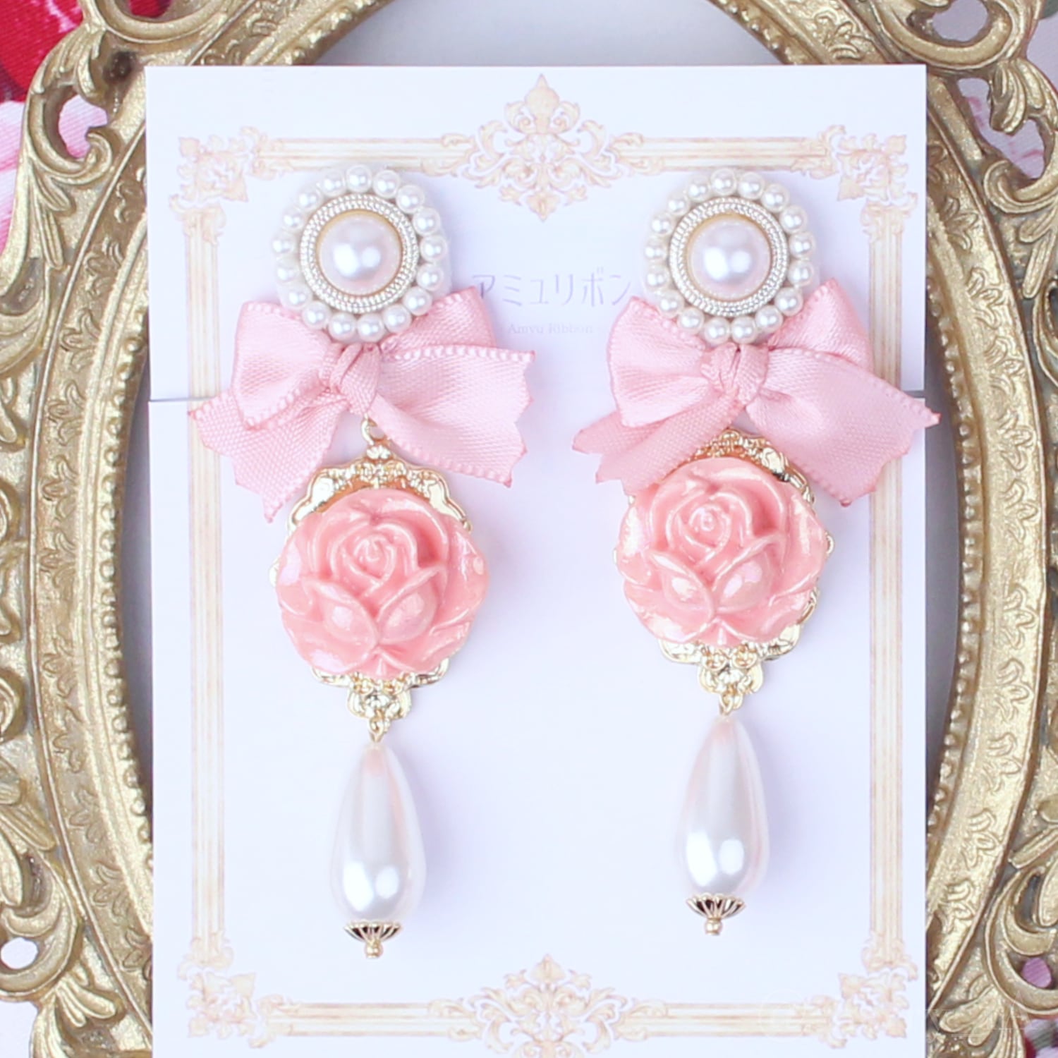 ロココ・ローズ庭園 耳飾り 〈華やかに咲く春薔薇のピアス/イヤリング〉クラシカル リボン パール ピンク サーモンピンク