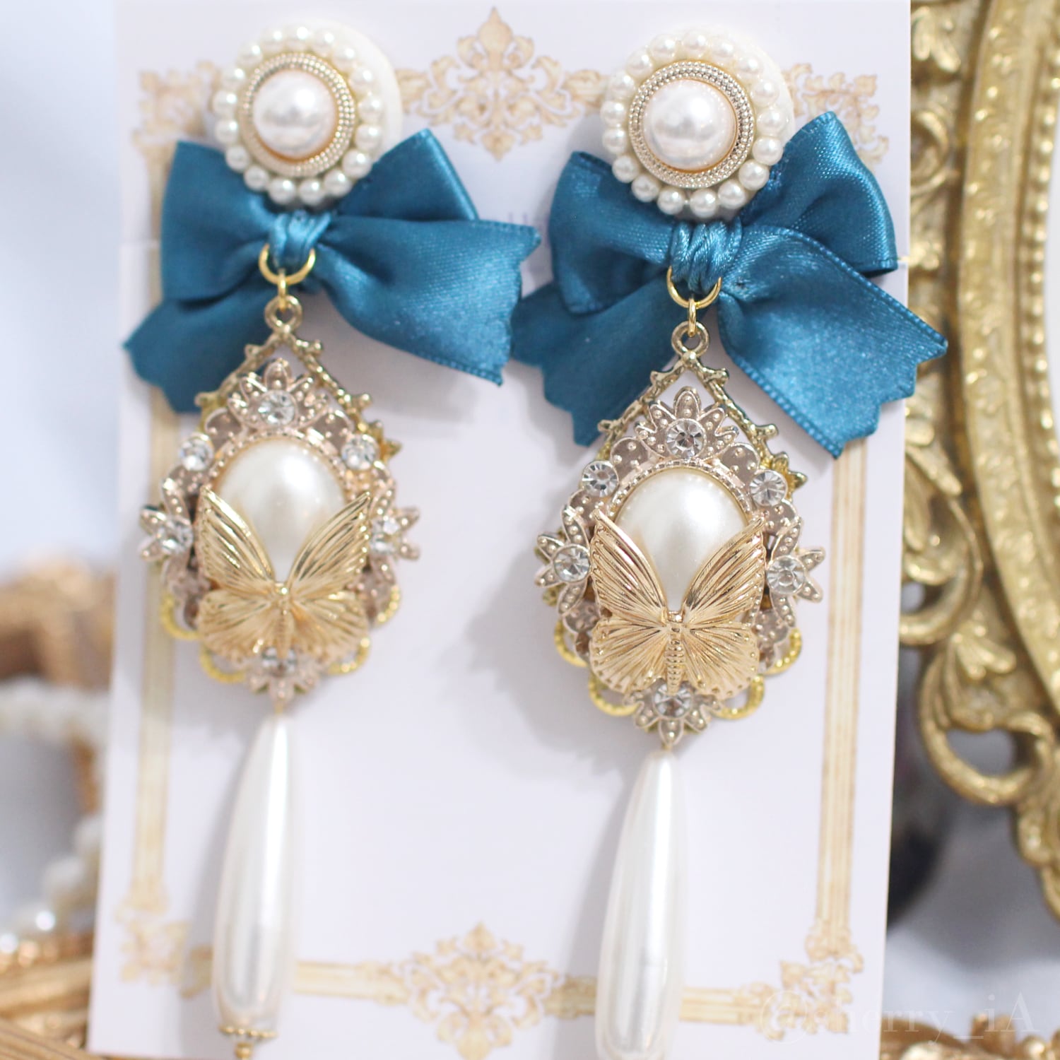 幻想蝶の煌めくオーラ【ロリィタ/ロリータ 量産型 蝶々 リボン リース お花 フラワー パール ピアス/イヤリング】-ロイヤルブルー/ブルーグリーン-