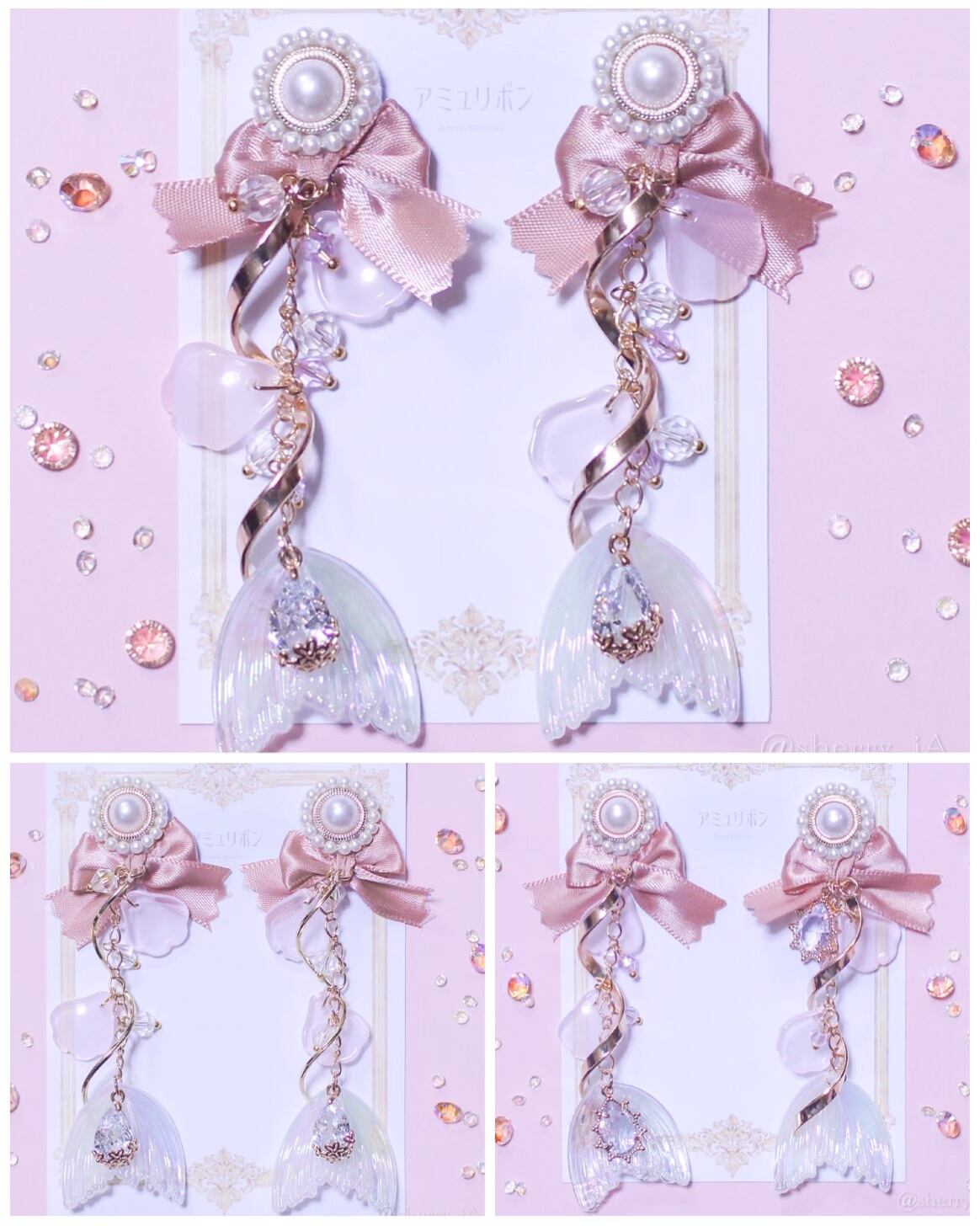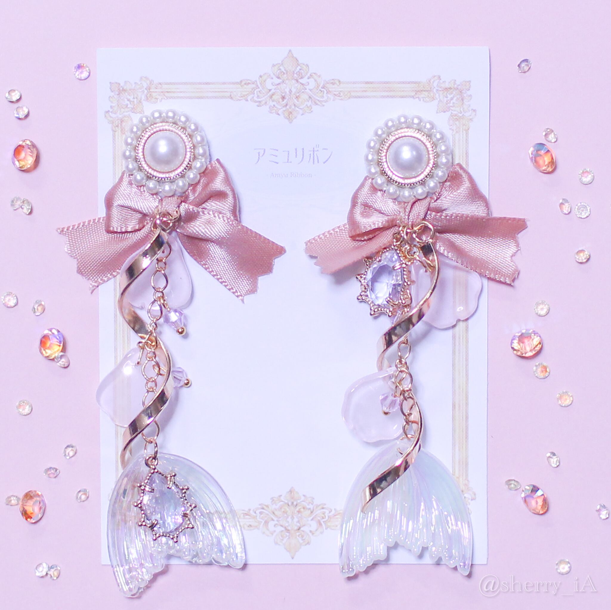 光輝く春の煌めきとsakura mermaid 【ロリィタ/ロリータ マーメイド 人魚姫 オーロラ 桜 サーモンピンク ピンク リボン パール ピアス/イヤリング】