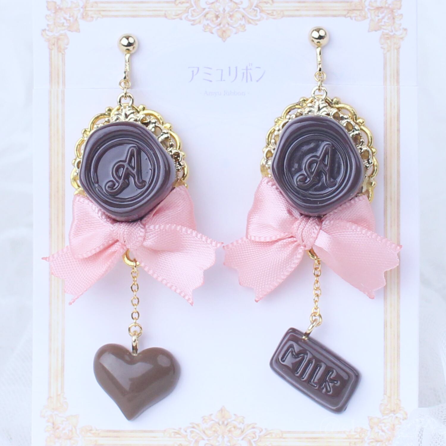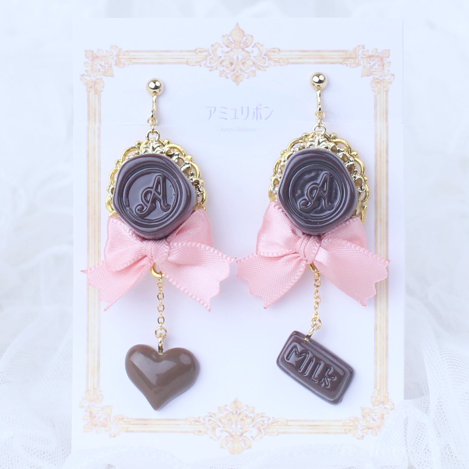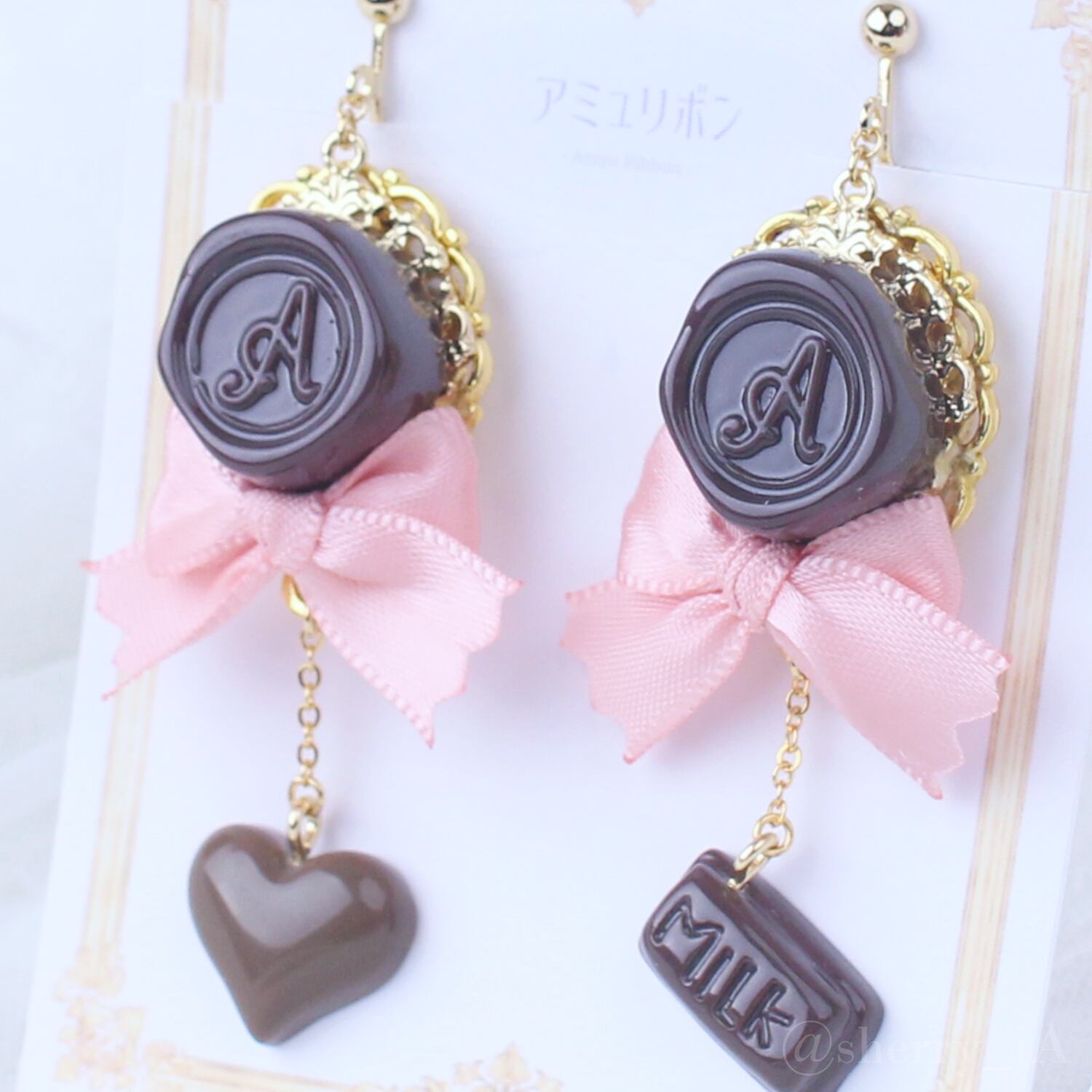 ロマンスチョコの耳飾り【ロリィタ/ロリータ リボン バレンタイン チョコレート フェイクスイーツ ショコラ シーリングワックス シーリングスタンプ ピアス イヤリング】