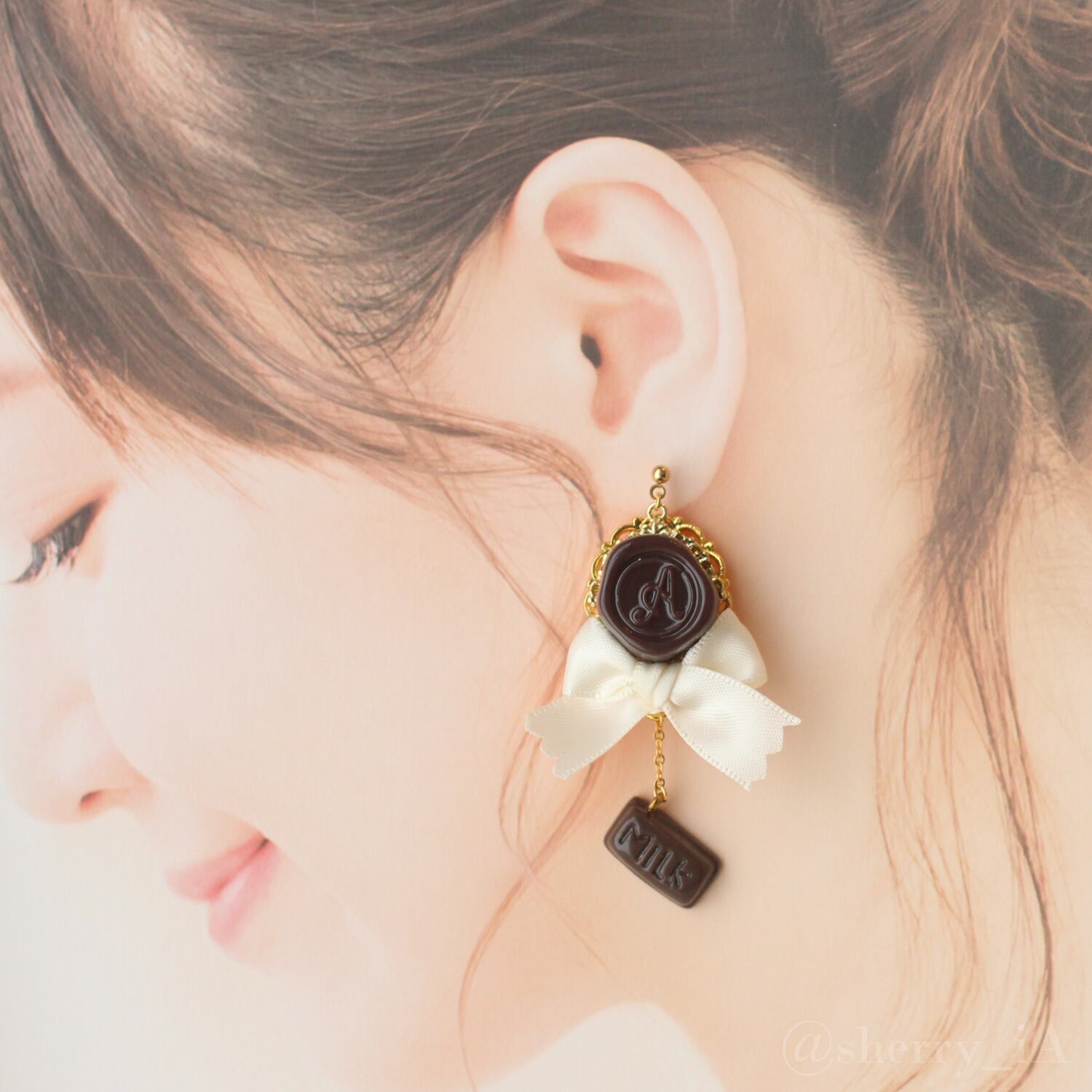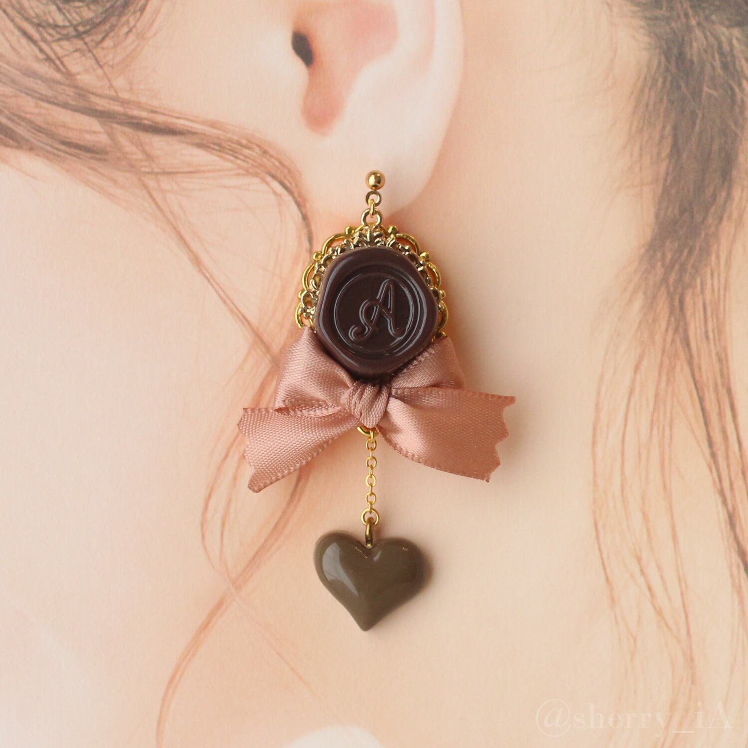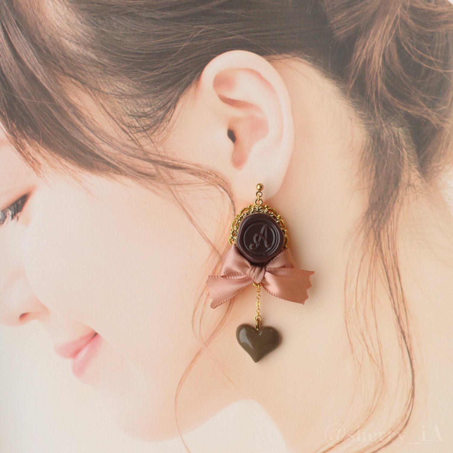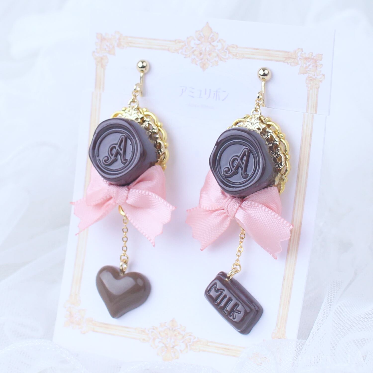 ロマンスチョコの耳飾り【ロリィタ/ロリータ リボン バレンタイン チョコレート フェイクスイーツ ショコラ シーリングワックス シーリングスタンプ ピアス イヤリング】